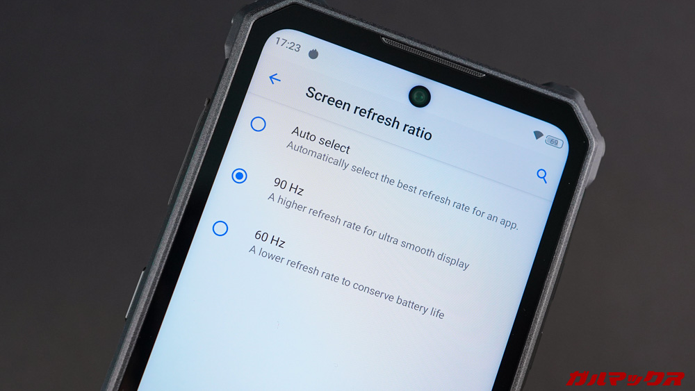 ▼設定画面で60Hz/90Hzの切り替えができます。30Hzの差は結構大きく、指に吸い付いて画面がスクロールしてくれますし、表示にブレがないのでマジで長時間触ってても目が疲れにくかった!↓