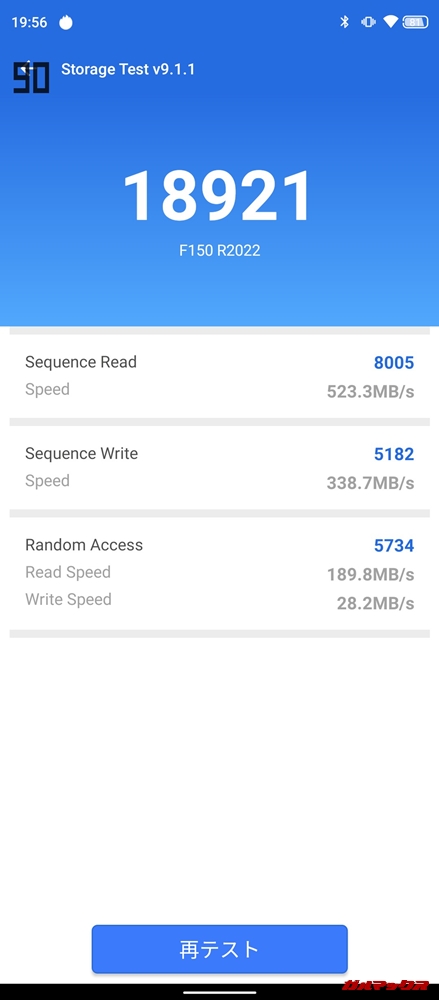 ▼ストレージ速度は読み込みが523.3MB/s、書き込みが338.7MB/s。この辺は普通。↓