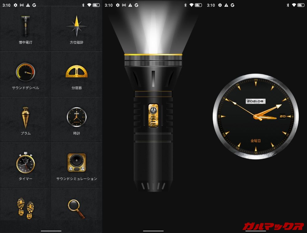 ▼ツールボックスがアンティークって感じなUIデザインになってるのが特徴的。黒に金ってカラーリングはカッコいい!贅沢言うならMIUIとかOne UIみたいな完全独自カスタマイズOSだったら面白かったけど、労力もコストも半端ないし仕方ないっすね。↓