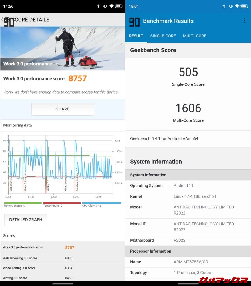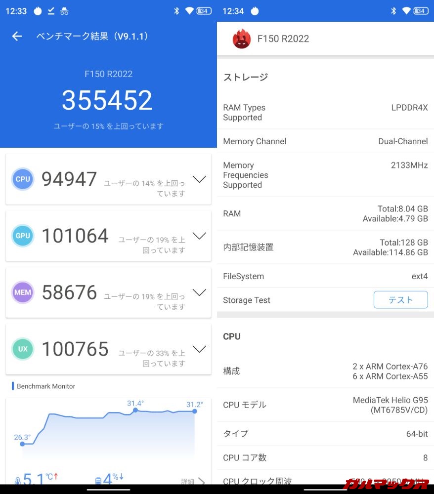 iiiF150 R2022のSoCはHelio G95です。端末の処理性能を数値化するベンチマークをチェックしてみましょう。