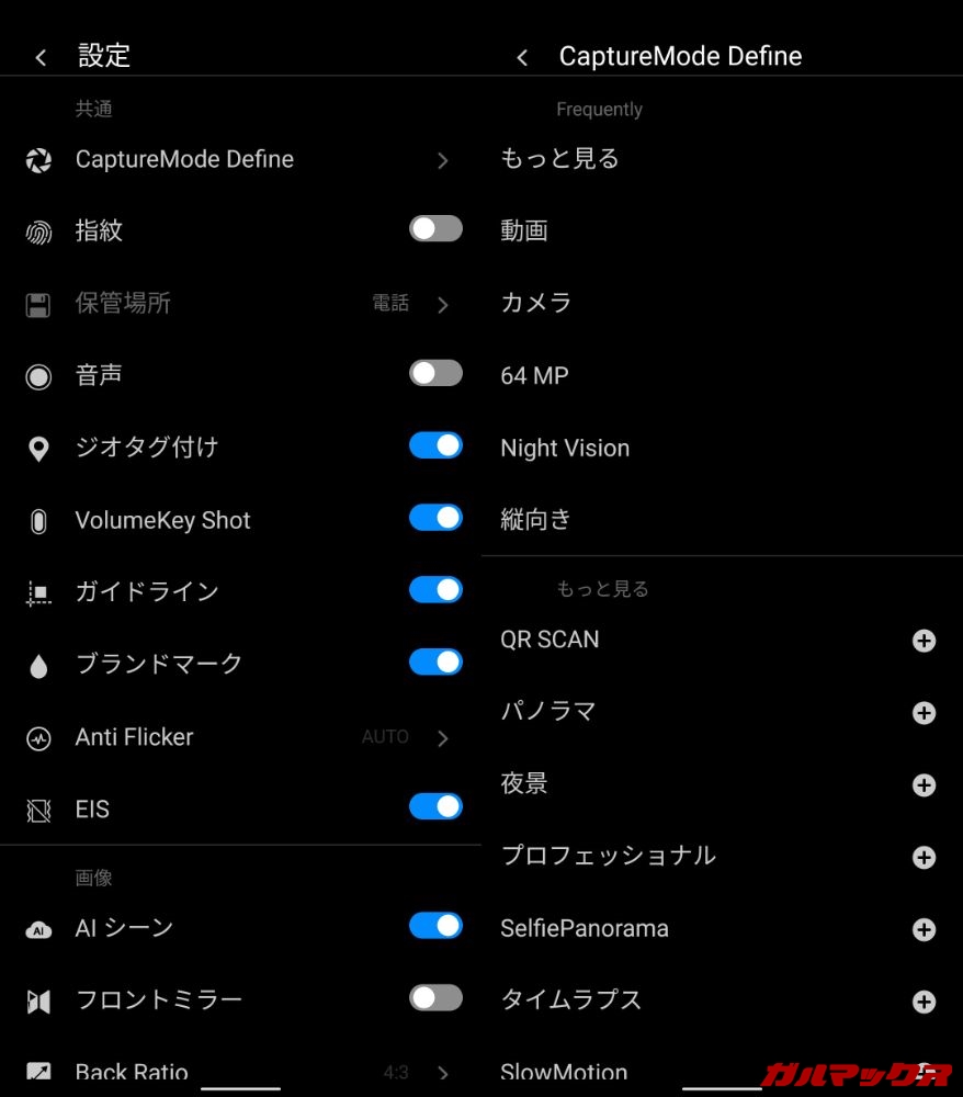 ▼ただ、カメラの設定項目は思った以上に豊富!むしろ音量キーだけでなく指紋センサー(電源キー)を押してのシャッターもできるという地味に他の端末にはないこともできるのは面白い(でも使いづらい)!↓