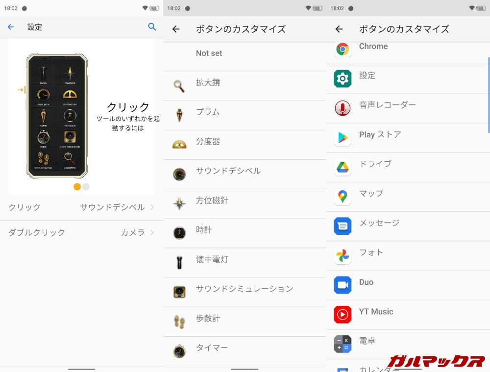 ▼ただ他タフネスモデルよりは柔軟性がないのはネック。というのも、一回押し、二回押しの動作しか選べないことと、それぞれで「一回押しはツール系」、「二回押しはアプリ起動」しか選択できないんす。↓