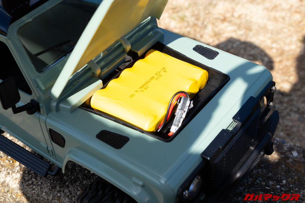 ▼ボンネットの中にはバッテリー!このバッテリーは付属する充電器(USBタイプの充電器なのでスマホの充電アダプタ使って充電するタイプ)で充電しましょう!↓