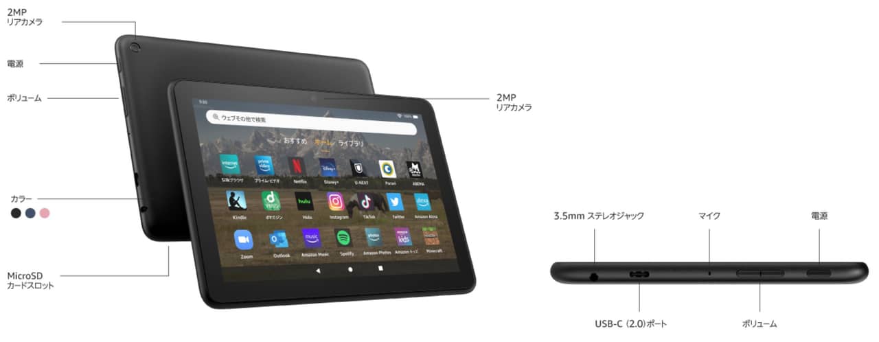 ▼Fire HD 8(2022)のカラーはブラックとブルーとピンクの3色。Amazonのロゴが入っているのが特徴。↓