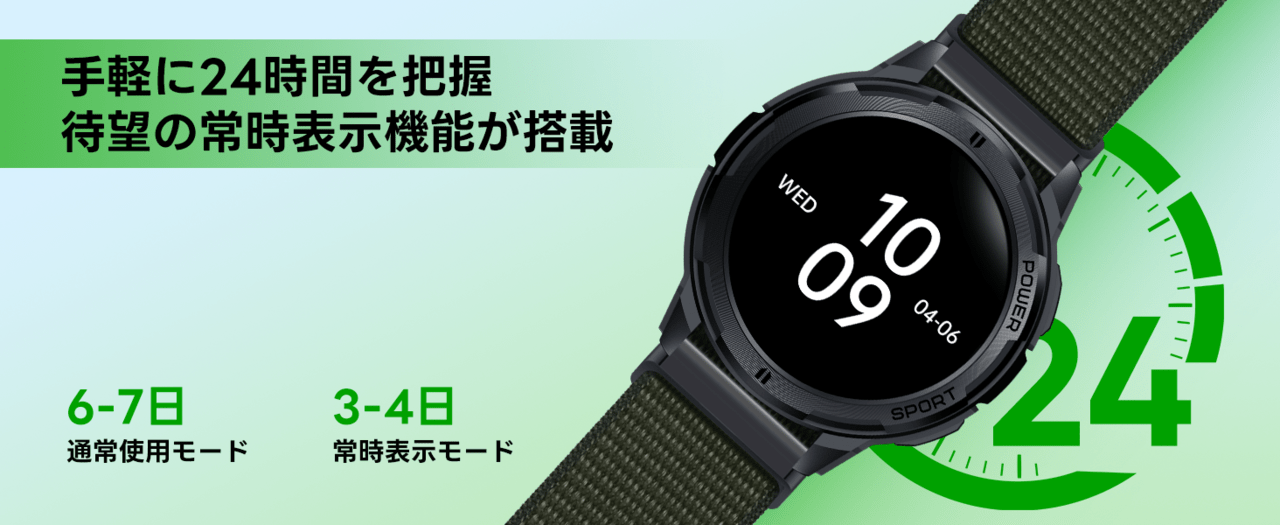- 電池持ちは通常で6~7日、AoD使用で3~4日の公称値