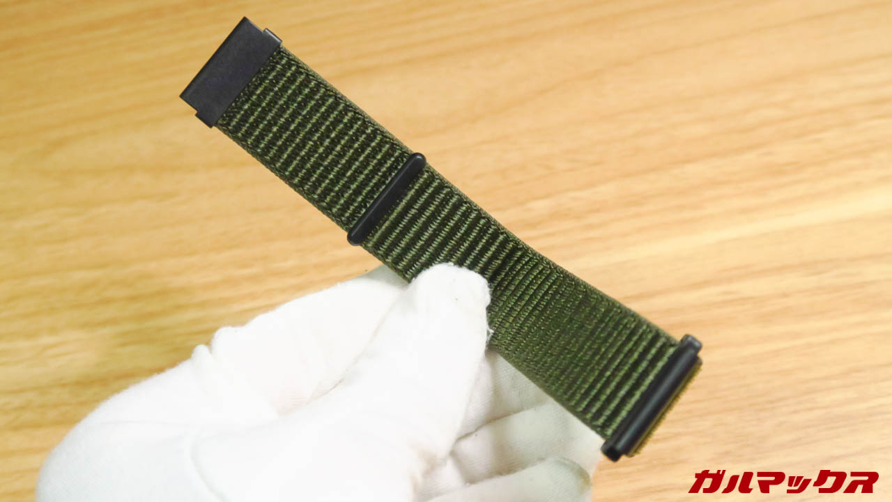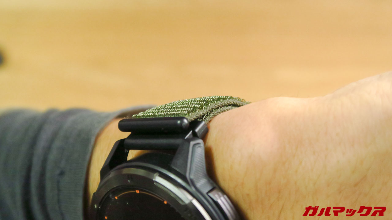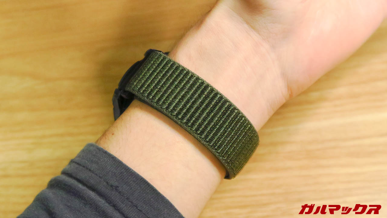 ▼グリーンのバンドは付属品でついてます。装着すればこんな感じ。ナイロン製で汗かいたり水濡れしても乾きやすいのは良い。織り込みタイプ特有のこそばゆさもなく装着性もGoodでした!↓