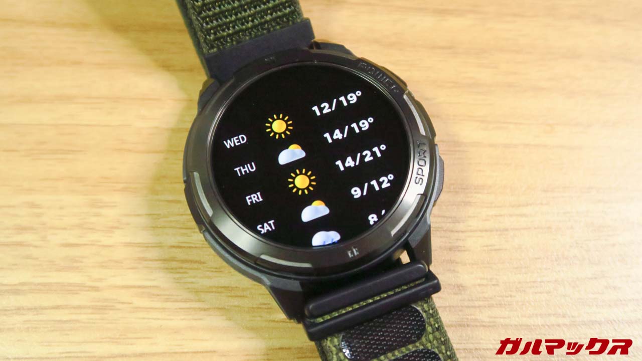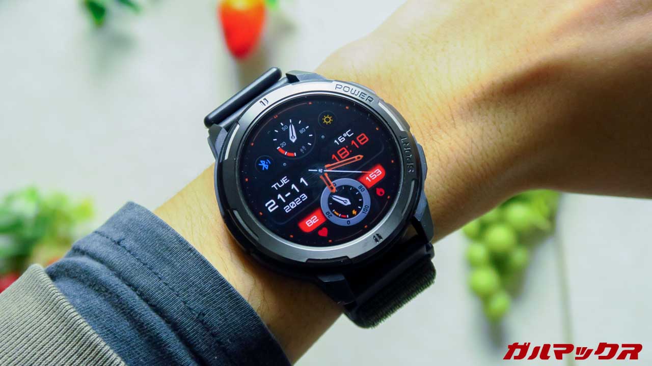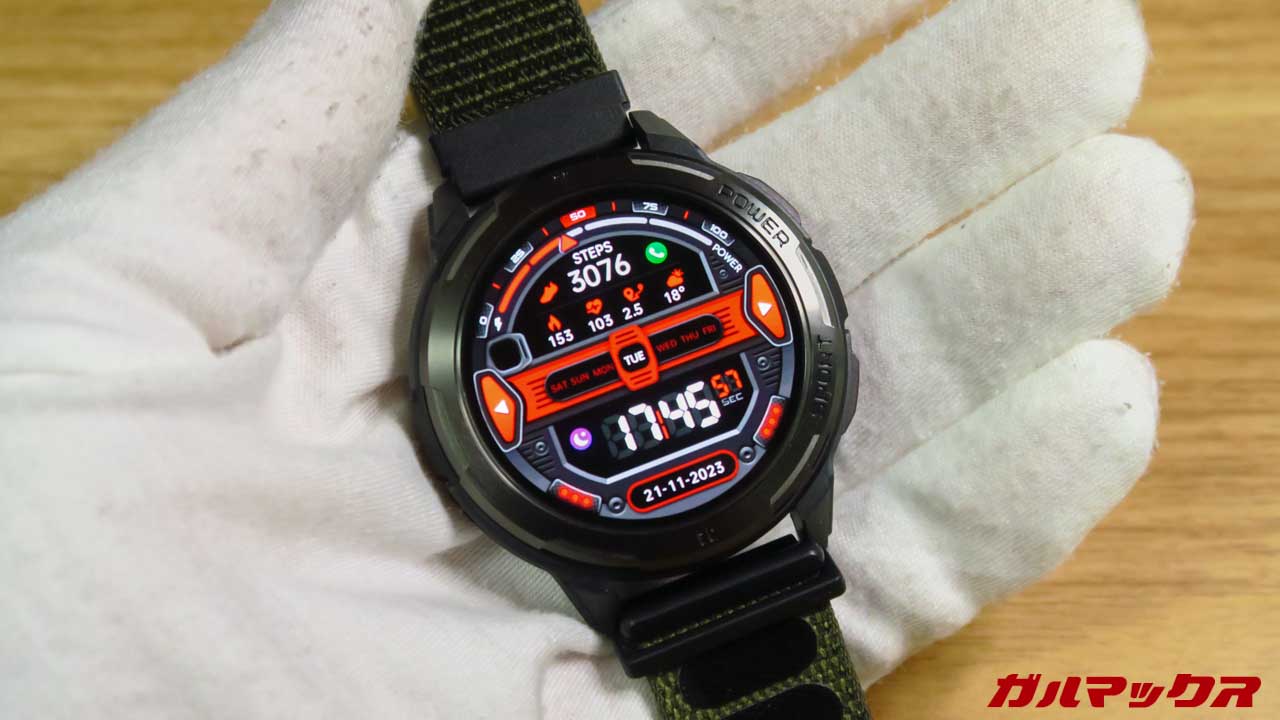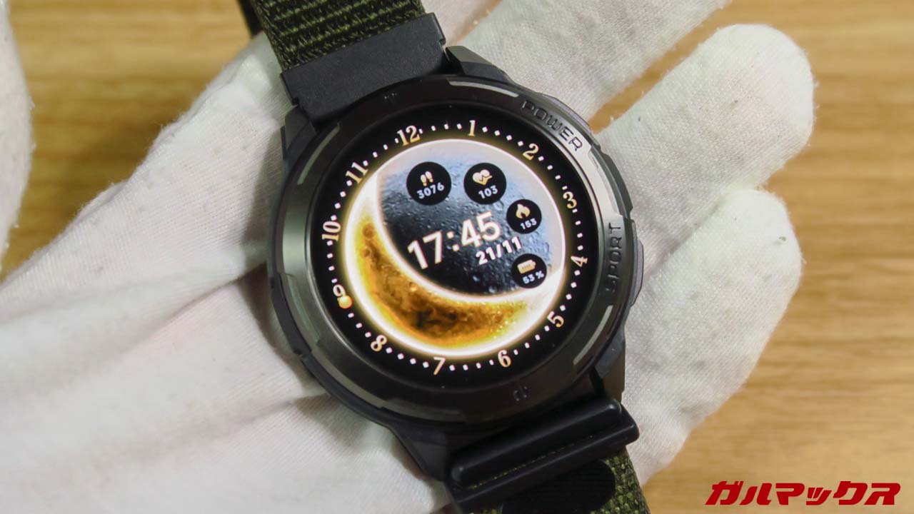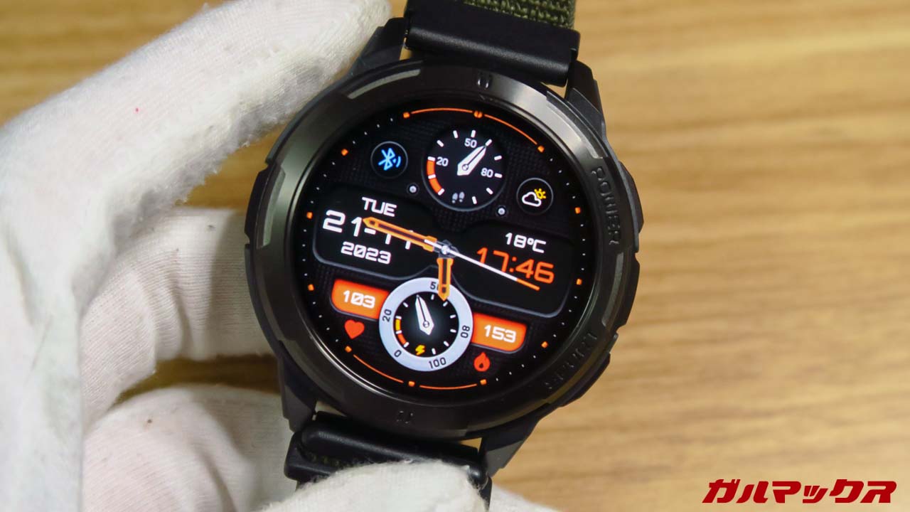 ▼ディスプレイは1.43インチ、有機ELで解像度も高めで視認性自体は文句なし。見栄え自体はハイエンドにもひけを取らないぐらい良いです。最大1,000ニト対応で野外でもなかなか見える。↓