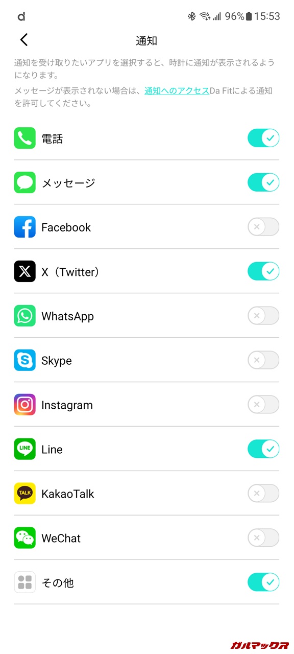 ▼とはいえ、通知を含めソフトウェア自体の作り込みは一昔前といった印象で、まさかの通知の指定アプリに制限ありでした。SNS系は個別で設定できますが、その他のアプリは全て一緒くたで。オンオフの個別設定が不可なタイプ。↓