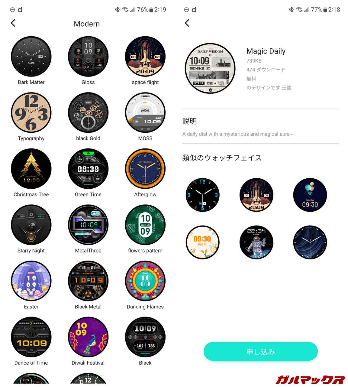 ▼スマホアプリ「Da Fit」から様々な文字盤デザインも導入できます。アプリ側でのデザインもかなり多いです。円形形状なのでアナログタイプの文字盤デザインもよく似合うぜ!↓