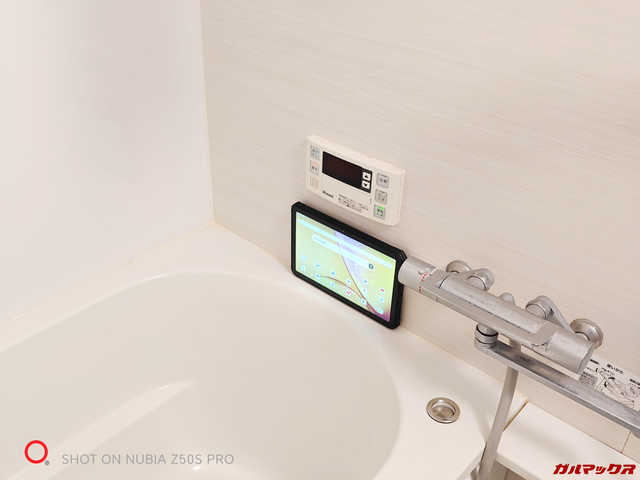 IP69Kに対応しているので僕は風呂に置いてます。重いので持つのは諦めて背面に粘着粘土みたいなのを使って壁に固定して備え付け風に使ってます。そのうち湯船にダイブしそうだけど…!↓