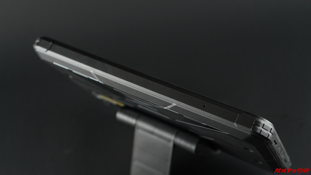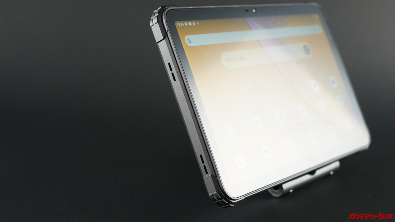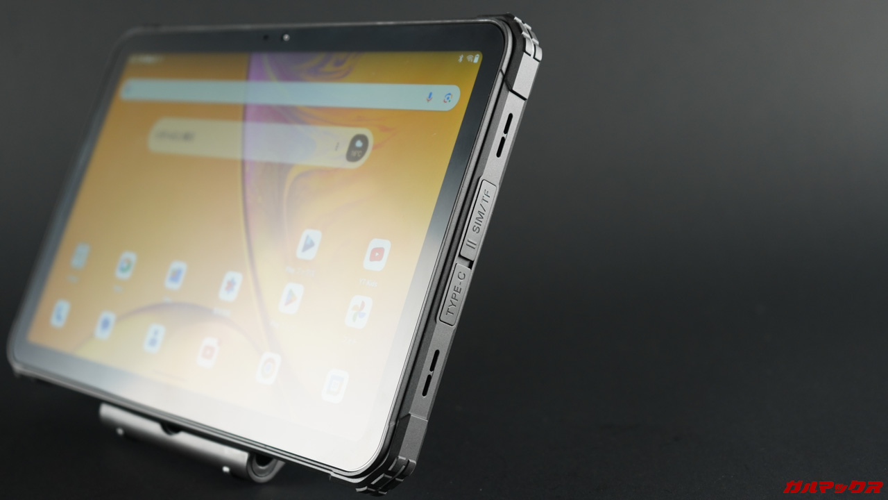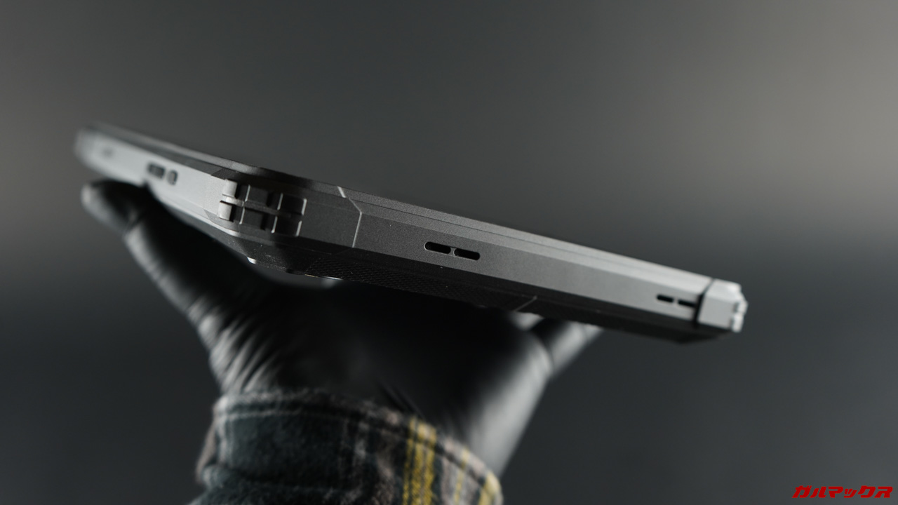 見よ、このボディーを!角のプロテクターや金属パーツをガンガン使ったその筐体はタフネスの名に恥じない屈強な作り。これぞ男のタブレット!↓
