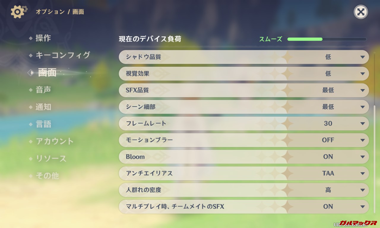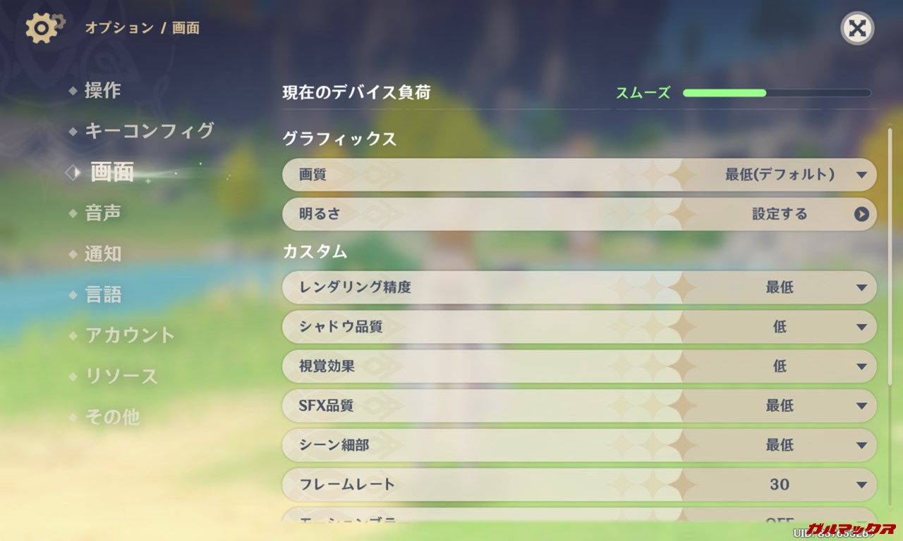 ガルマックスでは30FPSを超えると「楽しめるレベルで遊べる」としているんですが、原神のようなグラフィックがウリのゲームだと画質「中」以上で遊びたい…。