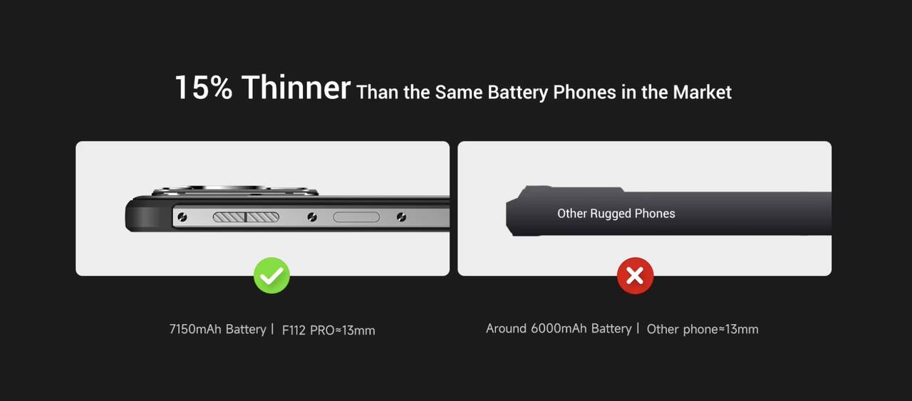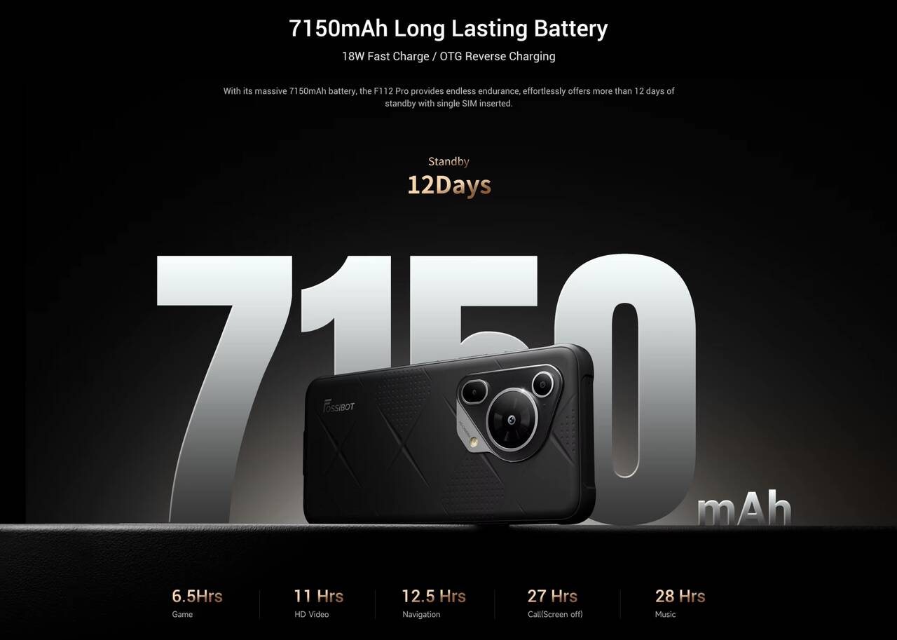 最近のスマホは容量が多くなってきて6,000mAhクラスに突入したが、FOSSiBOT F112 Proはなんと7,150mAhもの大容量バッテリーを搭載!