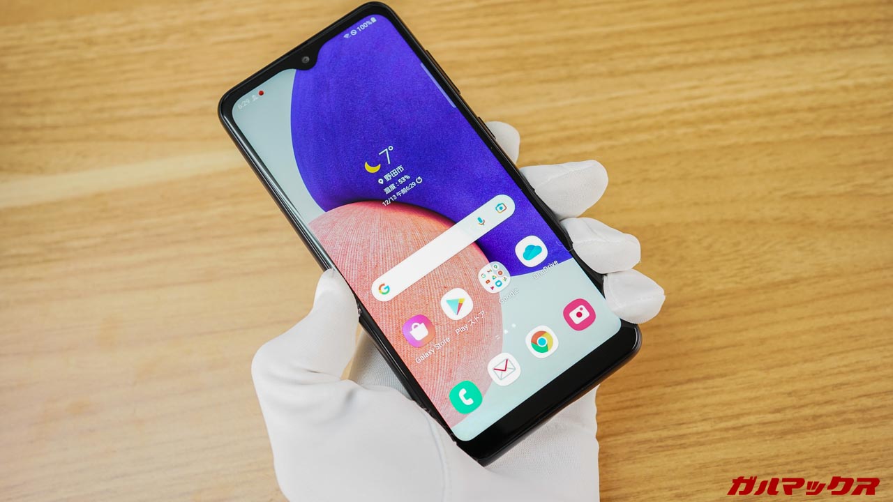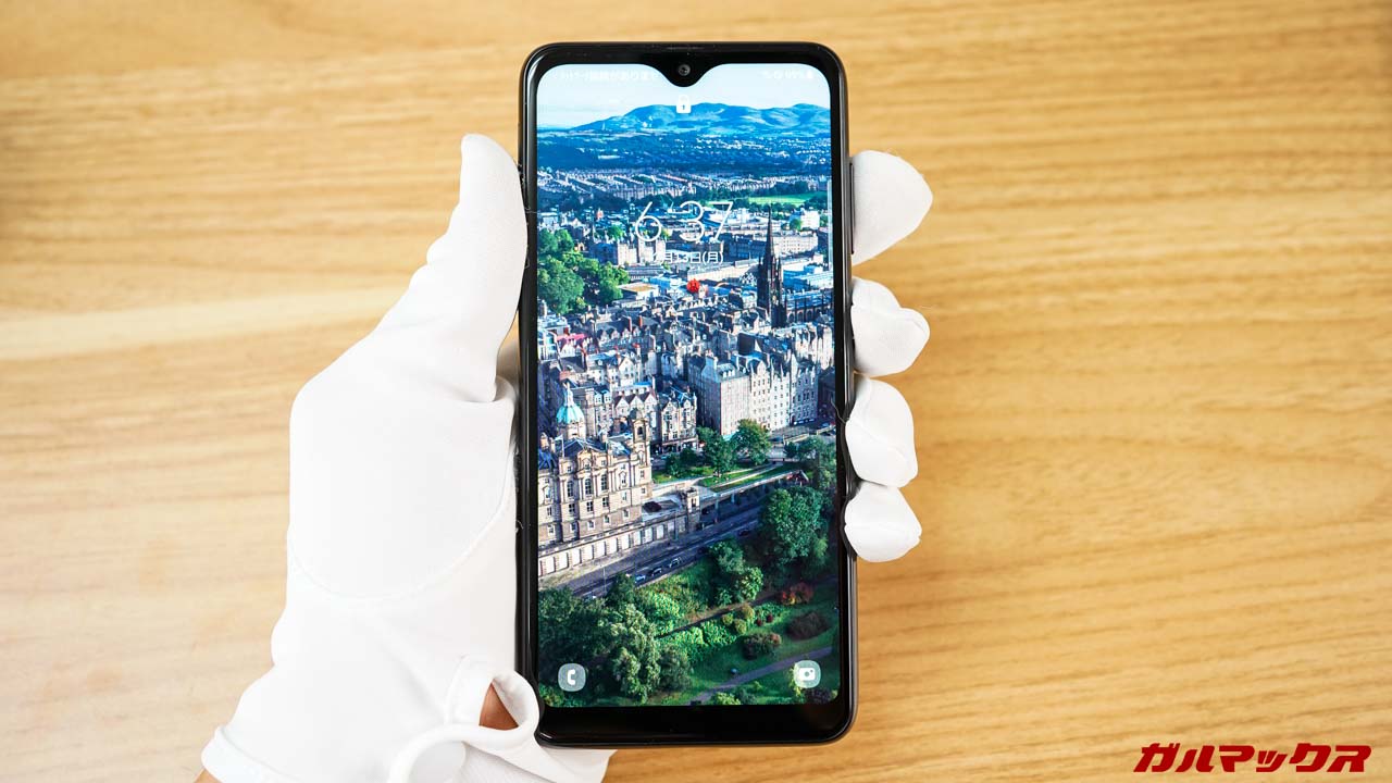 ディスプレイの外観やスペックは先代モデルのGalaxy A20(A21)と変わらない印象です。見た目も同じだし、解像度もHDクラスで液晶、高リフレッシュレートも非対応とエントリーらしさを感じます。