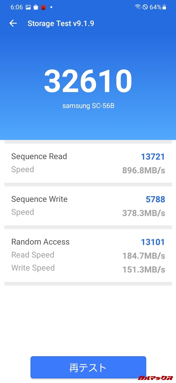 ▼ストレージ速度は読み込みが896.8MB/s、書き込みが378.3MB/sでした!↓