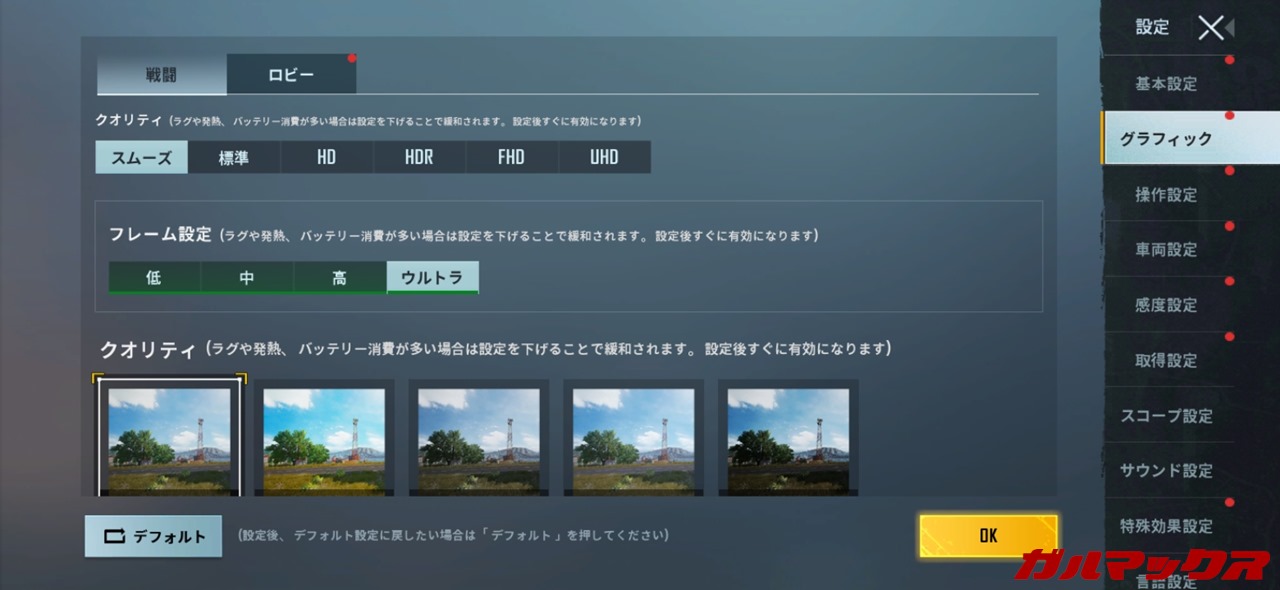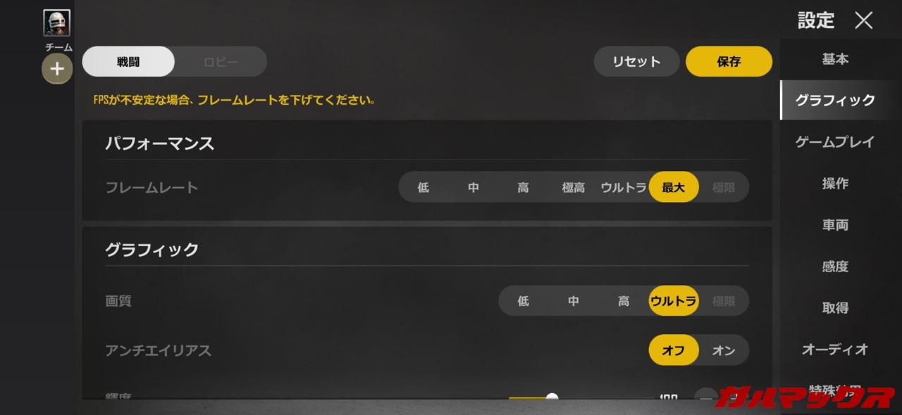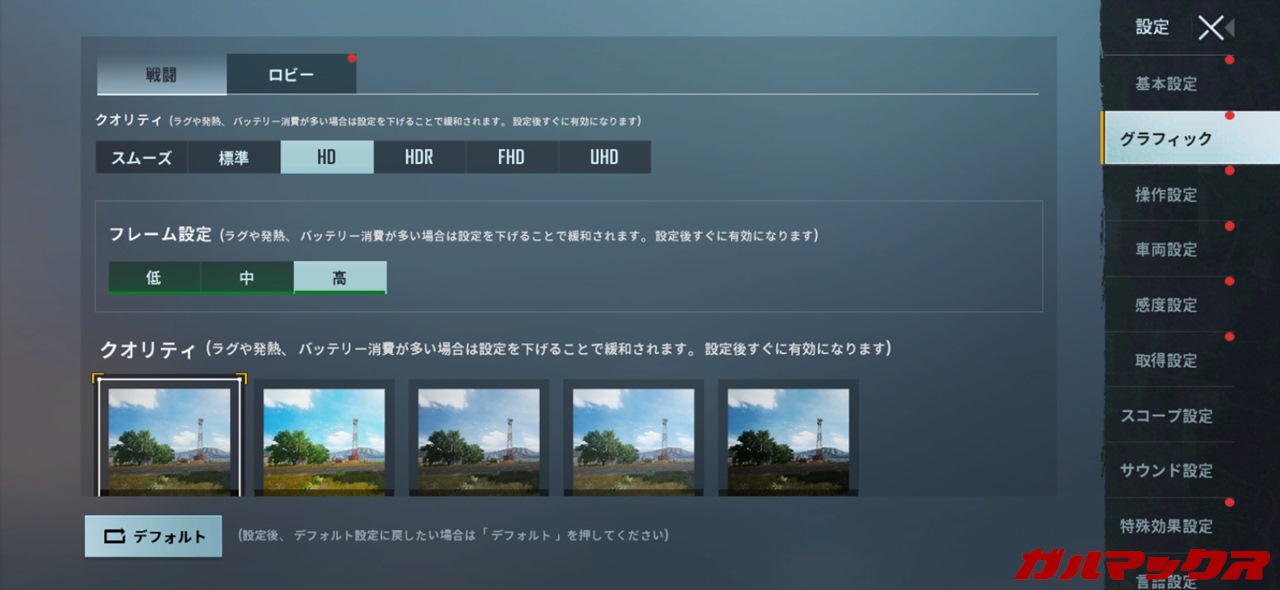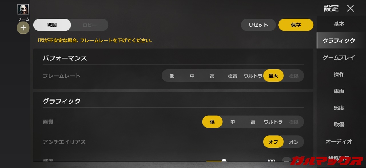 ▼PUBG:Mobileでの画質・フレーム設定は以下の通り。↓