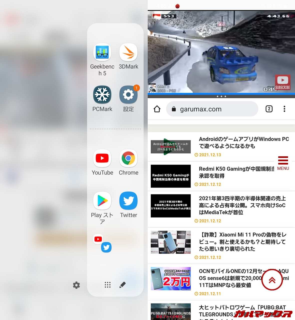 ▼またサイドからスワイプすることでアプリショートカットを開くエッジパネルも便利!さらにワンタップで分割状態で起動もできるという優等生っぷりなので「WEBやSNS見ながら動画を楽しむ」なんてマルチな使い方もやりやすい!↓