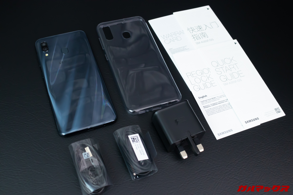 ▼海外モデルのGalaxy A30は本体以外に充電器、充電ケーブル、ケース、クイックガイド系の書類、イヤホン、SIMピンが付属していました。↓