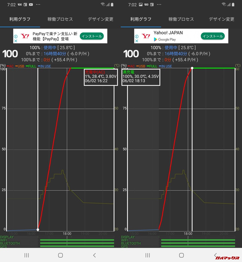 ▼充電時間の測定はバッテリーが付属充電器を使って満充電までの時間を測定します。電源を入れて測定アプリを起動するため、数%の誤差はご了承下さい。充電開始時間が16時22分で満充電が18時13分、充電時間は約1時間51分。充電器は最大9V1.67V(約15W)の出力に対応しているので、そこそこ速い結果となりました。↓