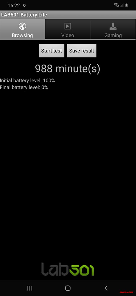 ▼輝度50%にてLAB501アプリでWEB閲覧・スクロール・リロードを繰り返しで満充電からバッテリーが切れるまで測定しました。連続駆動時間は988分(16時間28分)。この位のバッテリー持ちであれば1日十分バッテリーが持ちそうです。↓
