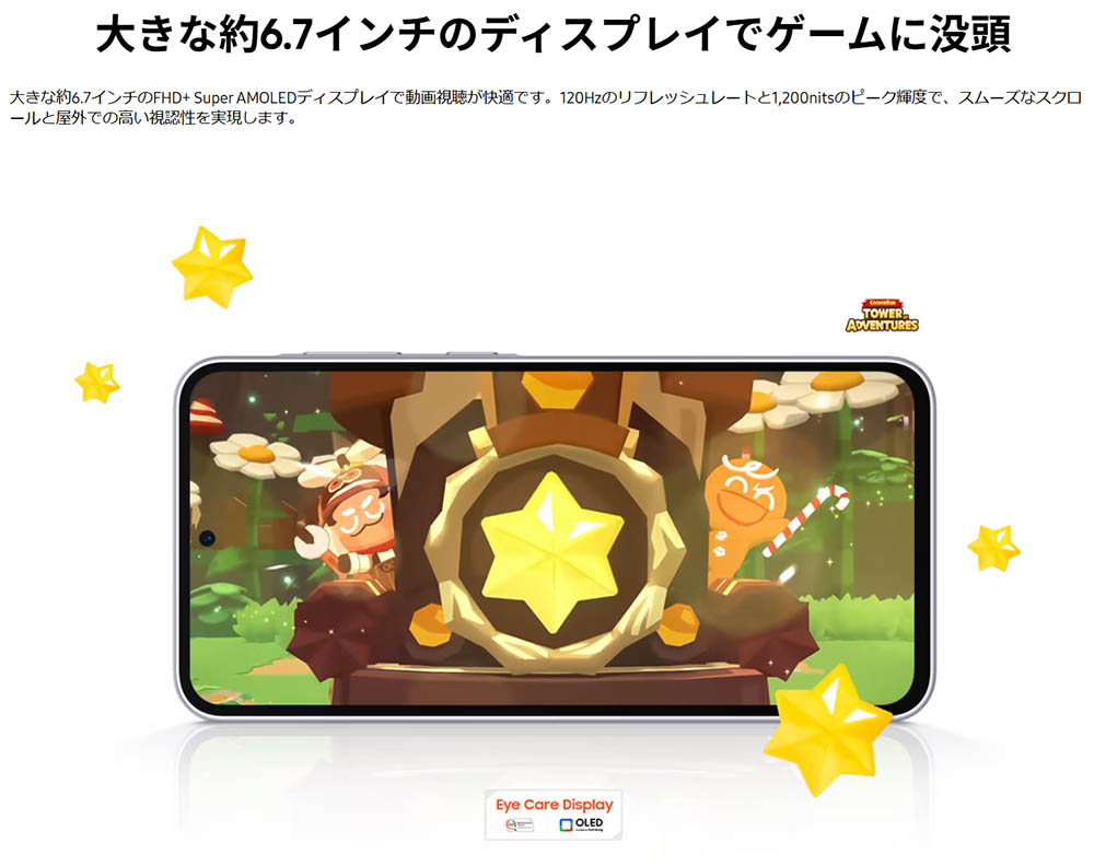 | ディスプレイ | サイズ:6.7インチ 材質:有機EL 画面占有率:非公表 形状:パンチホール(中央) 最大リフレッシュレート:120Hz 最大タッチサンプリングレート:非公表 |