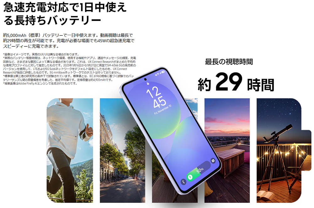 バッテリー容量は5000mAh、45W(Super Fast Charging 2.0)の急速充電に対応しています。バッテリー容量は2025年のスマホとしては少ない最低限のレベルですが、Aシリーズで45W対応はデカい!