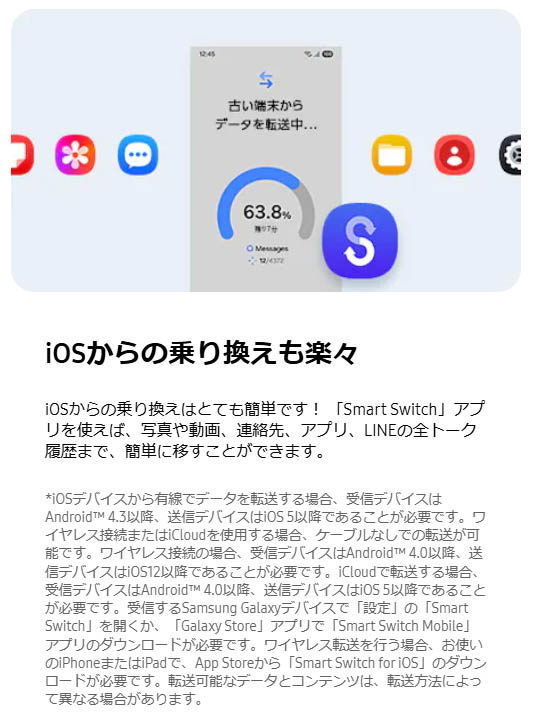▼Smart Switchというデータ移行アプリも搭載。写真、動画、連絡先、アプリなどを移行できます。↓