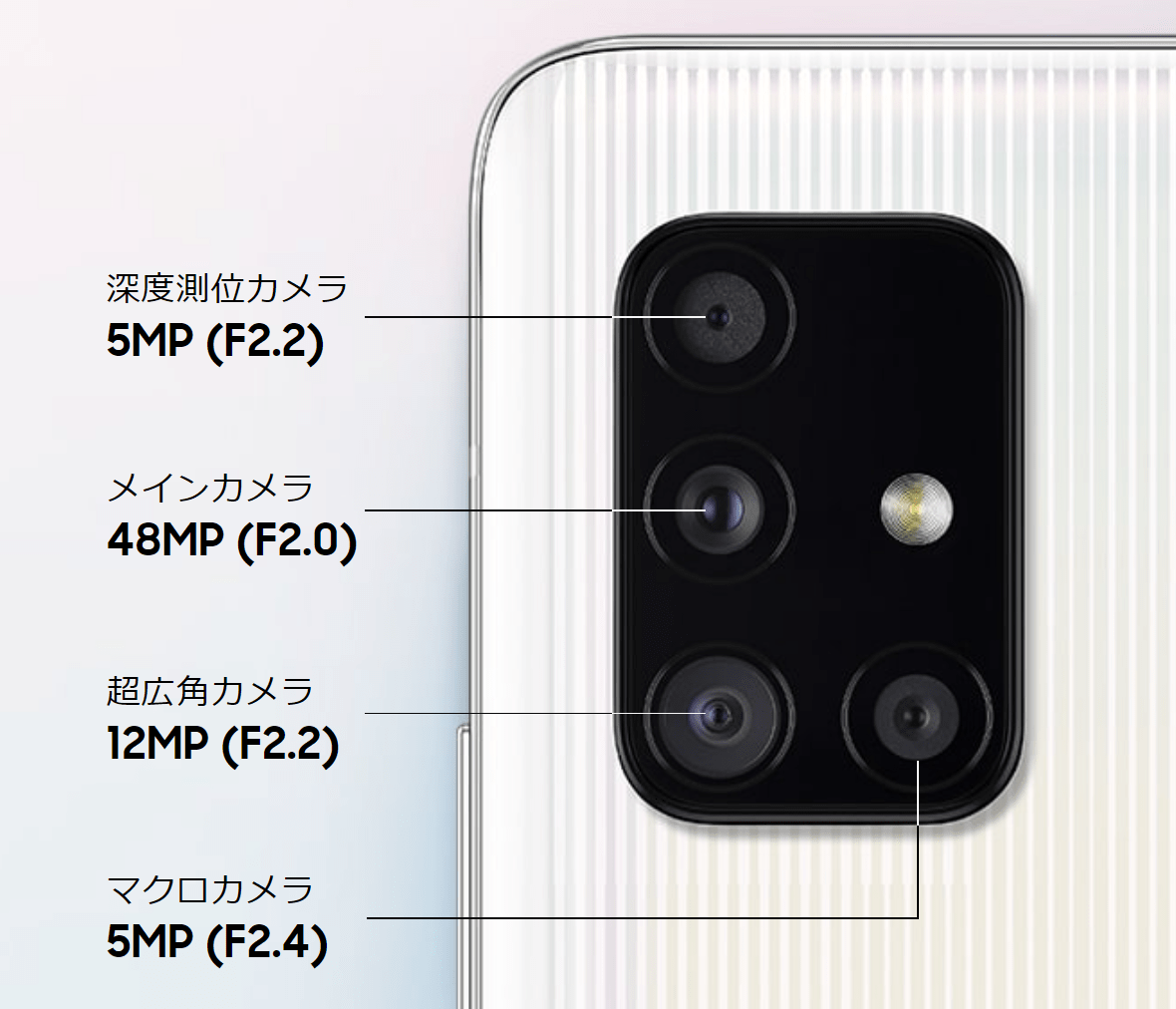 Galaxy A51 5Gのリアカメラは広角のメインカメラ(4,800万画素)、ワイド画角の超広角カメラ(1,200万画素)、接写用のマクロカメラ(500万画素)、深度測定カメラ(500万画素)の4眼構成です!