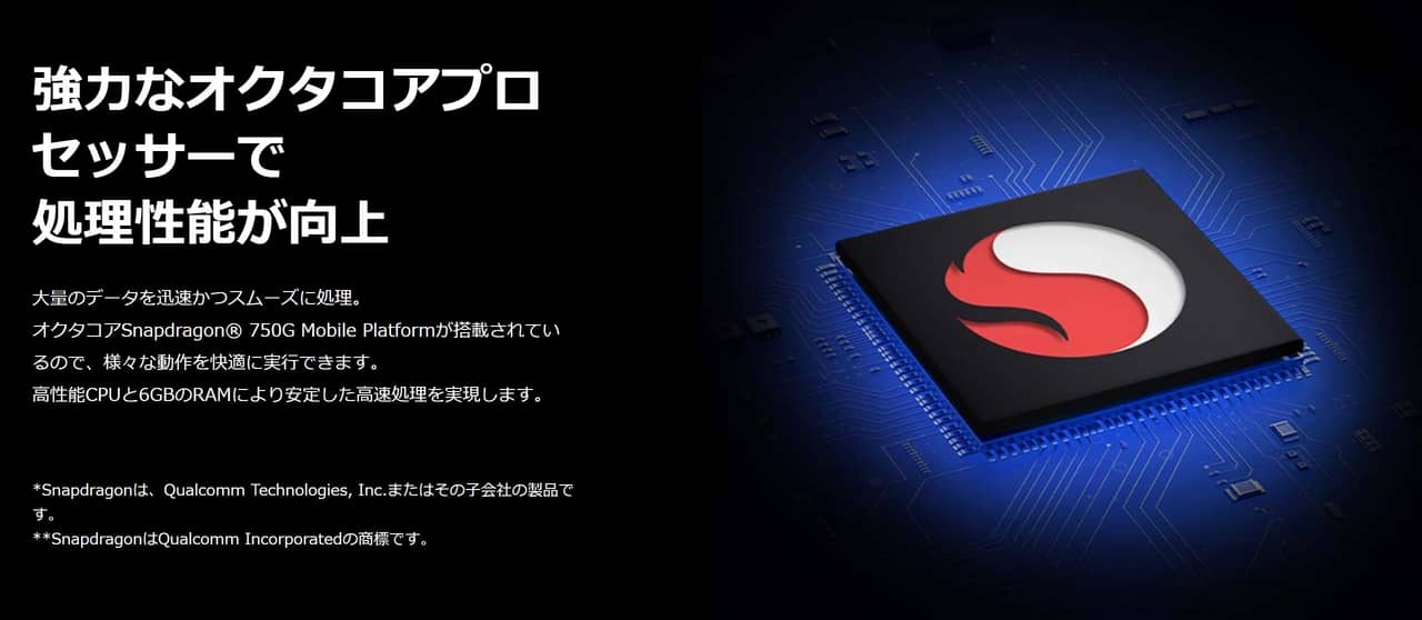 ▼またSAMSUNGではかなり珍しくSoCの型番が公表されています!SoCはSnapdragon 750Gを採用しており、ミドルハイクラスの処理性能を持つものとなっています。普段使い、軽いゲームは快適。↓