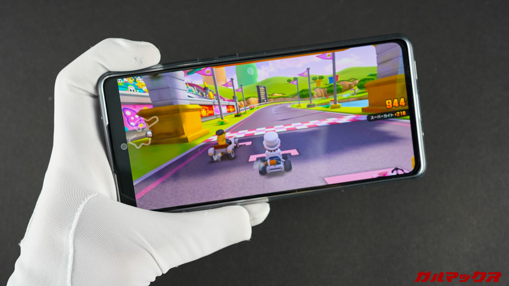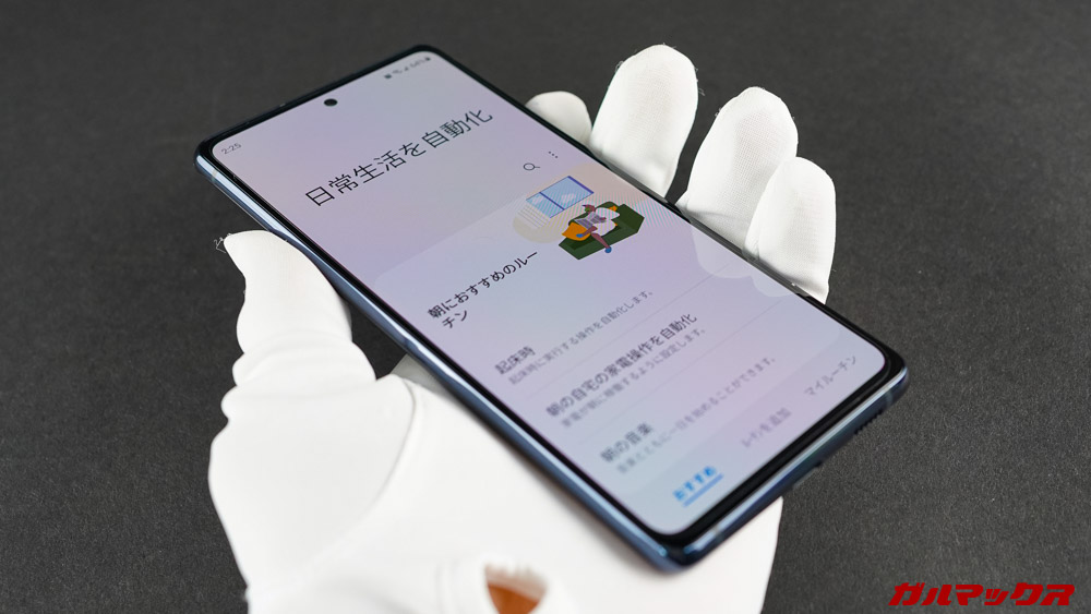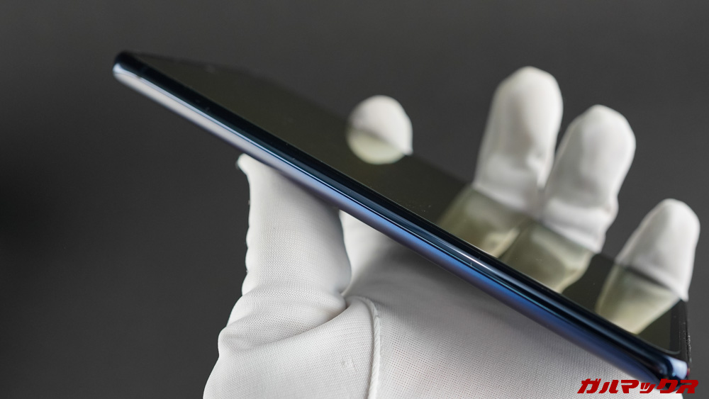 ▼サイズ自体はイマドキのデカいスマホ。つまりデカめです。ゆえに手がデカい筆者でも片手操作で苦労する場面はあります。一方、手触りはマットボディゆえにサラサラで心地よく、ハイエンドらしい質感の高さで大満足!↓