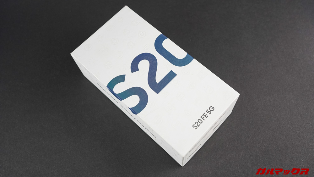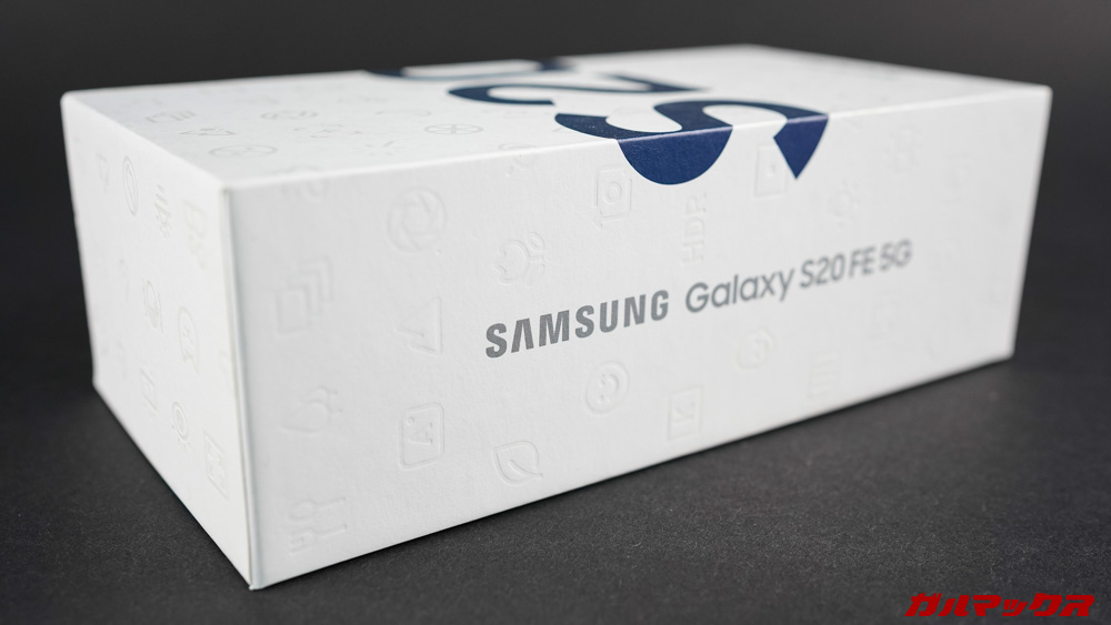 ▼外箱のデザインはポップなデザイン!大体のGalaxyスマホの外箱デザインは黒基調が多かったんですが、Galaxy S20 FEはとってもポップでモダンな印象を受けます。↓