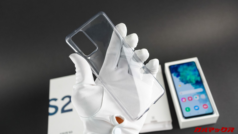 ▼自分の見てきた限り、Galaxyスマホって保護ケースが付属していることってあんまりなかったんですが、Galaxy S20 FEはクリアケースが付属してました(`・ω・´)。しかも耐久性のあるソフトな材質なのもGood。↓