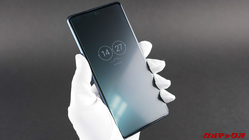 ▼貼り付けたらこんな感じ。サラサラな反射低減タイプでヌルヌルな画面との相性がいい感じ!端までしっかりカバーしてくれます。指紋認証も可能!↓