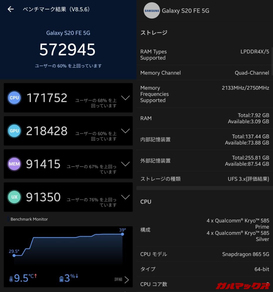 Galaxy S20 FEの処理性能・実機ベンチマークスコア