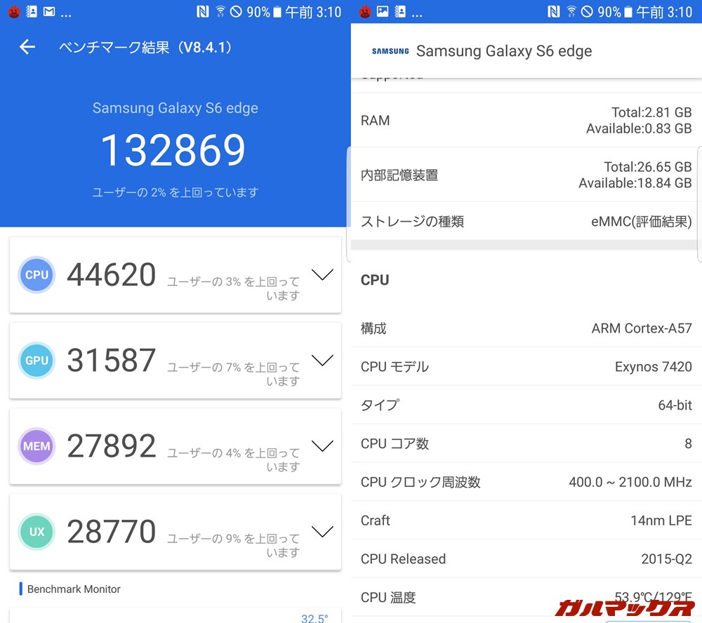 Galaxy S6 edge/メモリ3GB(Exynos 7420)の実機AnTuTuベンチマークを掲載しています。