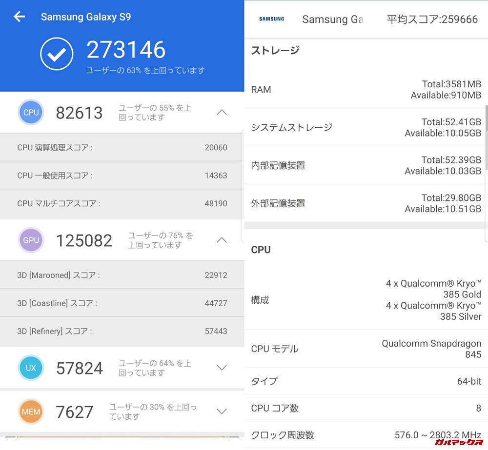 ▼以下のGalaxy S9(Android 8.0)実機AnTuTuベンチマークスコアは[Fのり]様からのご投稿です!ありがとうございます!↓