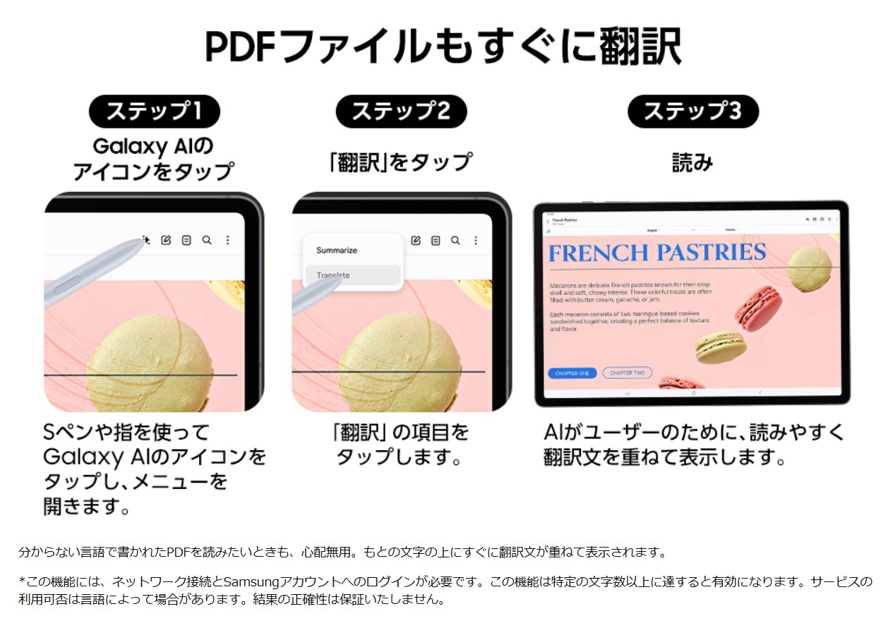 ▼Galaxy Tab S10+のウリとされているのがGalaxy AI。S24世代から搭載された機能となっています。↓