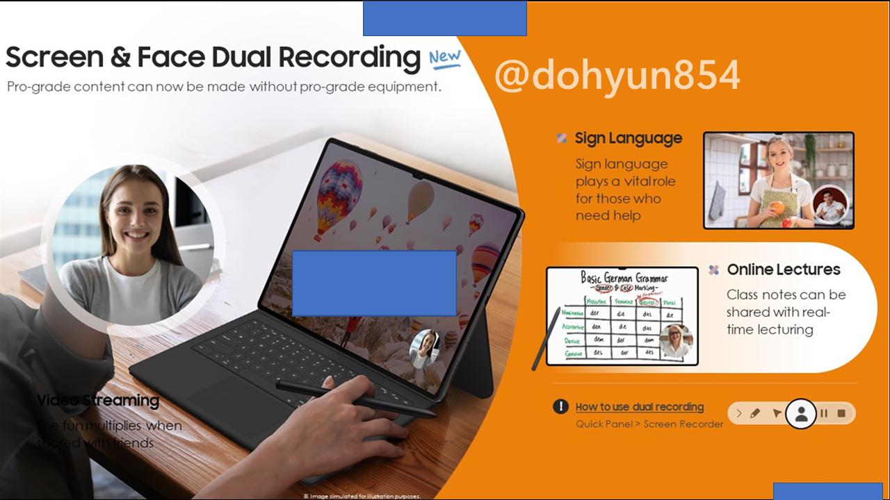 ▼またGalaxy Tab S8 Ultraはインカメラがデュアル式になっているようです。さらにオンライン上の配信において画面共有とインカメラの同時撮影ができるんだそうです!インカメラで自分の顔をワイプで写しつつ、画面上で資料やスライド内容といった表示を行い説明できる使い方ができるってことかな?ゲーム配信にも使えそう。↓