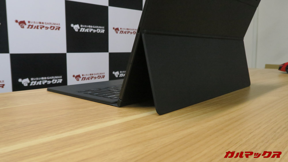 ▼背面のキックスタンドを立てれば自立可能!キックスタンドはかなりヒンジがしっかりしておりやや固いと感じるレベルだが、それゆえに超安定して自立できるのはGood。↓