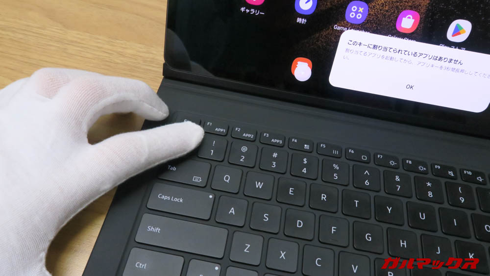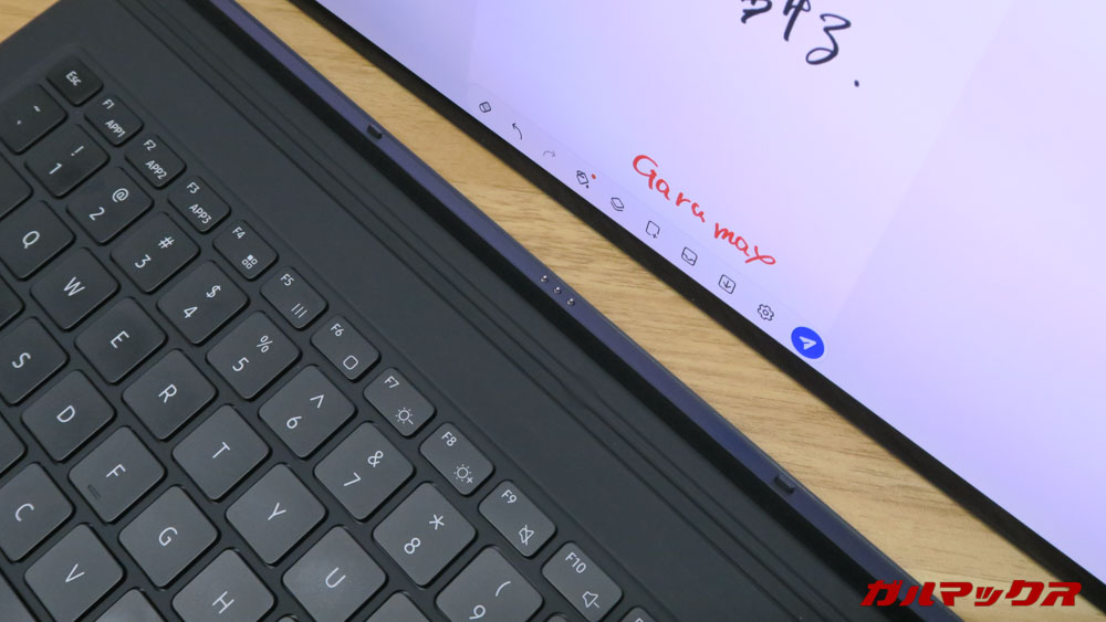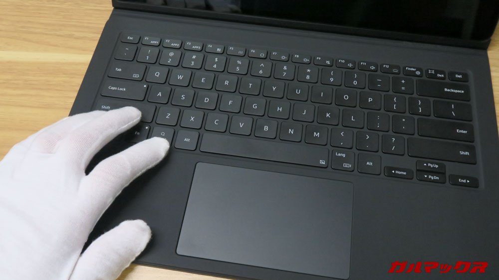 ▼キーボード自体はフルサイズとなっており、ほぼほぼPCと同じ感覚でタイピング可能。キーストロークは浅いが軽快にポチポチ打てるので記事を書くなどの本格的な文字入力も非常に快適だった。↓