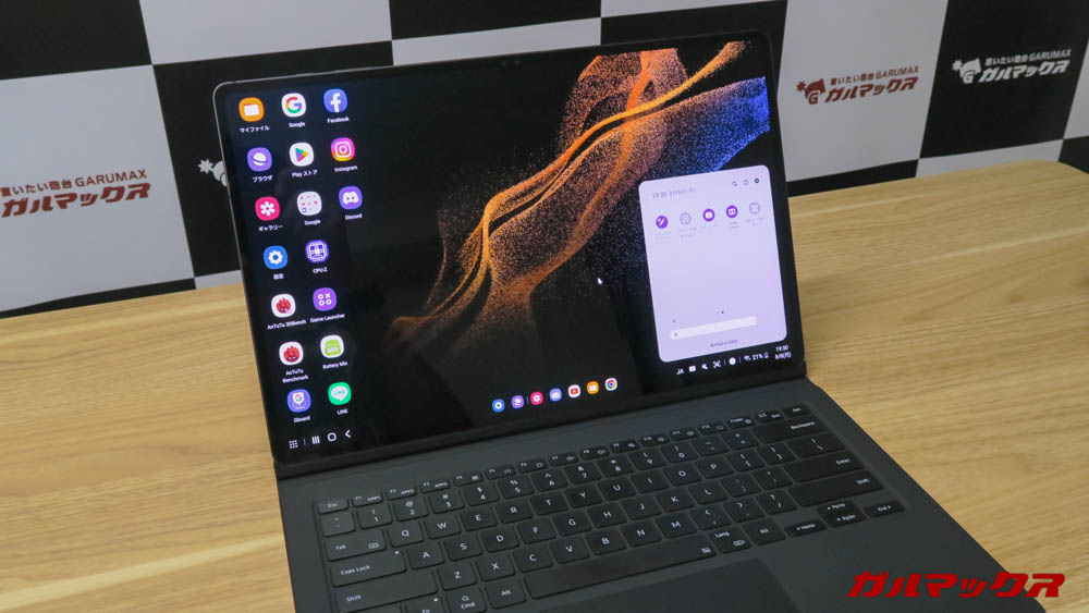 ▼Galaxy Tab S8 Ultra自体のサイズも相まって、もうノートPCにしか見えん。これを初見でタブレットと見抜ける自信は…オレには無い。↓