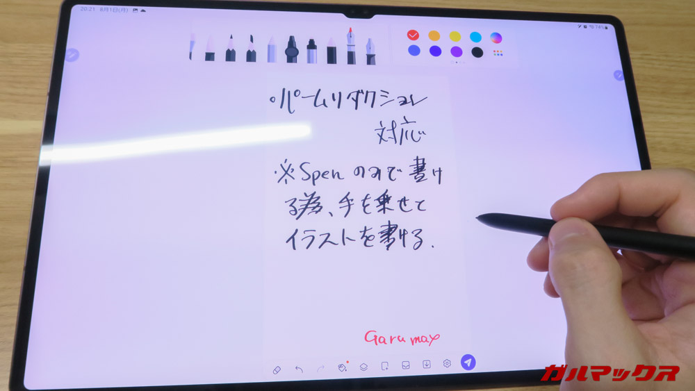 ▼パームリダクションも対応しているので、手を画面においても入力が誤検知されない!当然筆圧検知も対応しており、本格的にイラスト用途で使っていけるよう仕上がっている。↓
