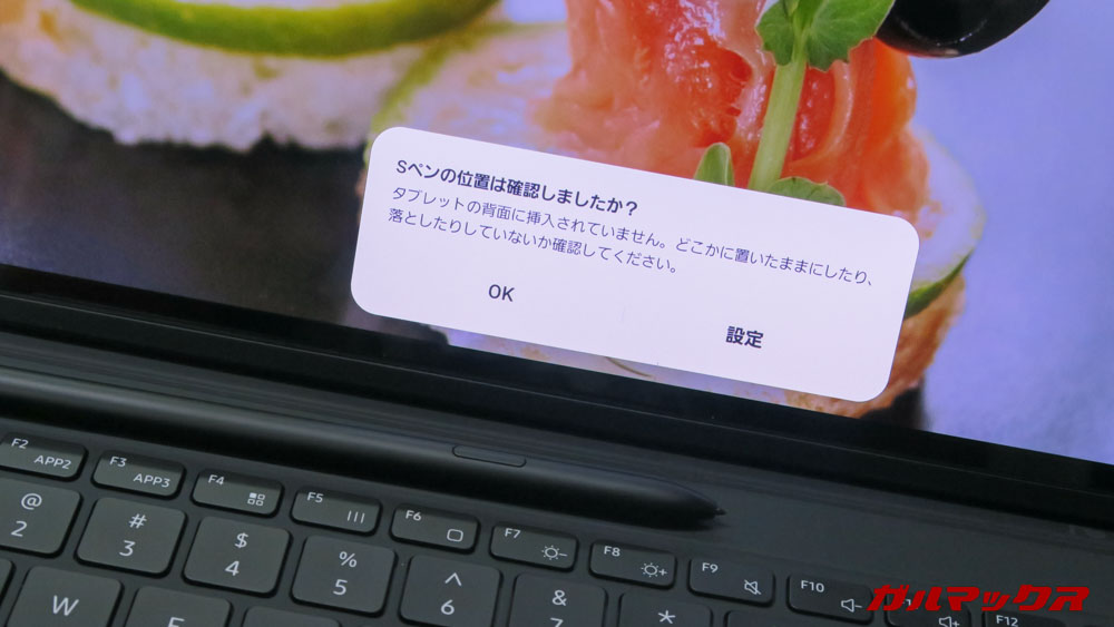 ▼あと、Sペンを置き忘れないようにアラートを鳴らす設定もあった。本体がスリープ状態かつペンを充電していない状態で一定時間経つと通知とともにこの表示が出てくる。↓