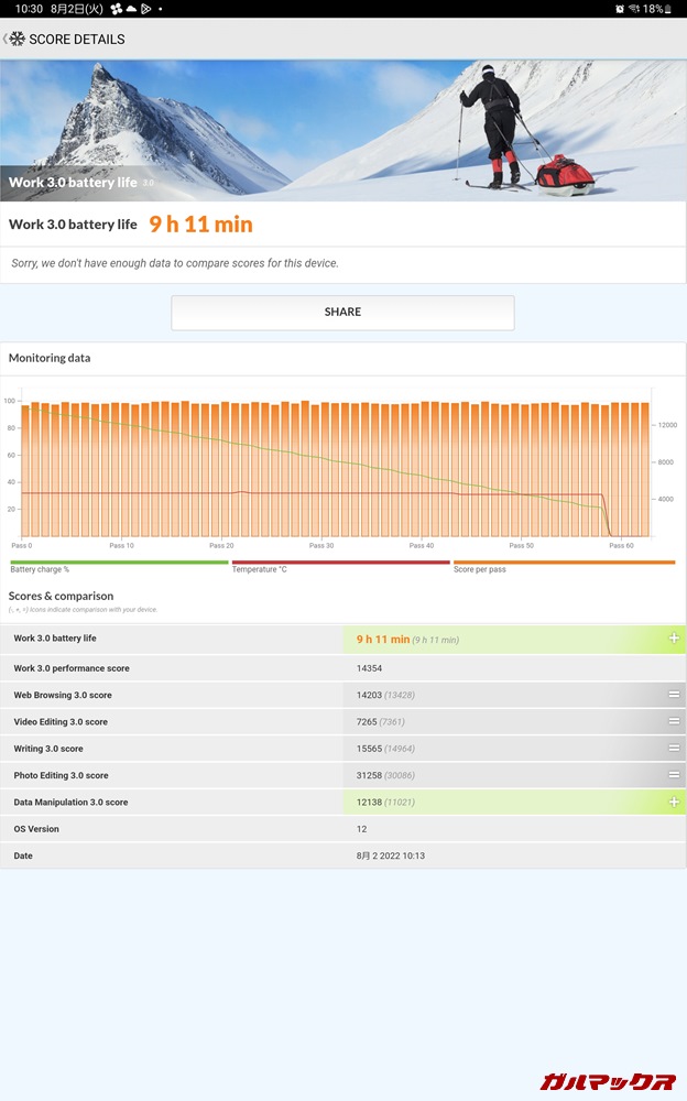 ▼Battery Lifeも試してみたところ9時間11分という結果だった。今までだと10~11時間が多かったので、やっぱ電池は持たないほう。外出先で使う場合は充電器を持ち運んだりリフレッシュレートを抑えるなど工夫が必要だな。↓