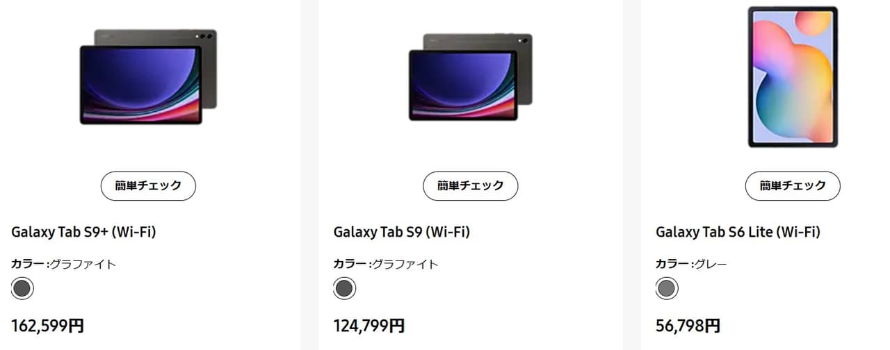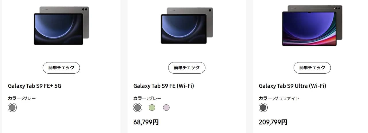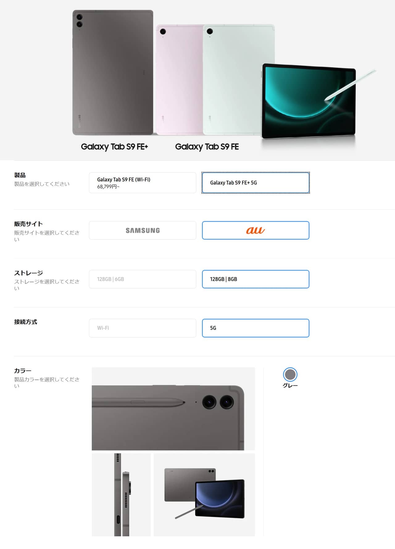 ▼一方、大画面12.4インチモデルであるGalaxy Tab S9+ FEではSIM対応モデルとなってます。しかしあちらはSIMフリー版はなくau版のみ。つまりキャリアモデルなんす。↓