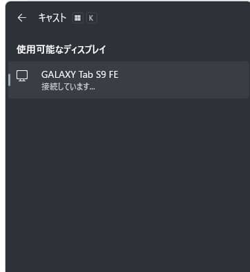 ▼タブレット側はこの画面のまま待機。あとはPC側でWindowsキーとKキーの同時入力でキャスト画面を出して接続すればOK。↓