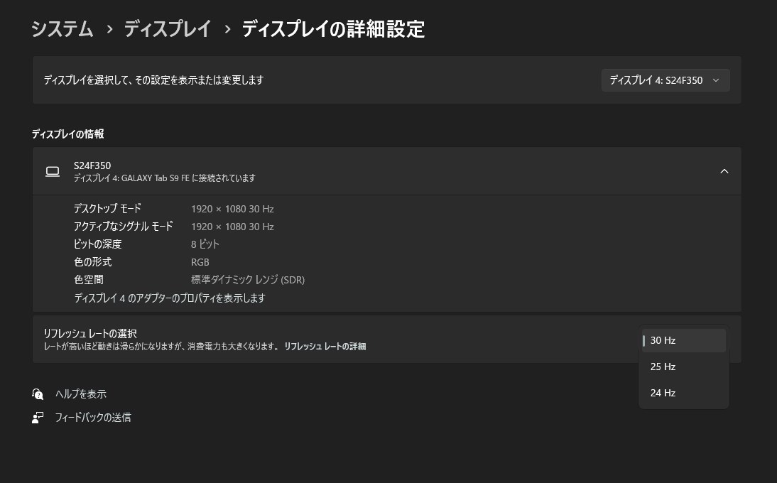 ▼ちなみに解像度は1,920×1,080まで、フレームレートは30FPSが上限でした。Windowsで見た感じ、24Hz、25Hz、30Hzまでしか選べんかったっす。↓