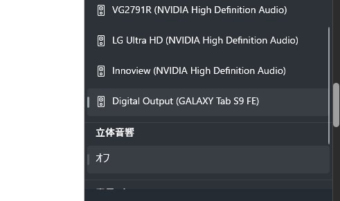 ▼ちなみに音声出力も対応していました。すなわちパソコンで出したサウンドをGalaxy Tab S9 FEのスピーカーで聞けるっちゅうワケっす。↓