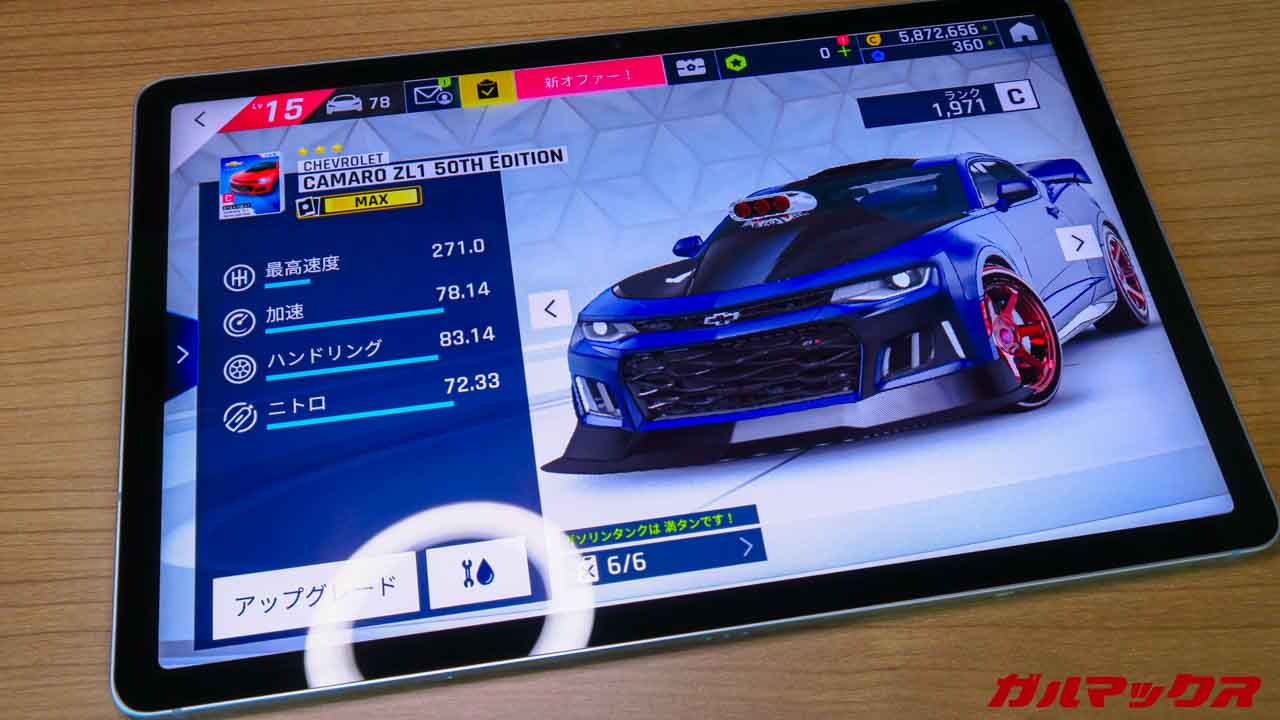 ▼AnTuTuスコア的にはXiaomi pad 5にかじりつくぐらいはあるんですが、あちらと違ってハイエンドSoCではないためか車ゲーのAsphalt 9では60フレーム表示に非対応。30FPSでレースゲームはキツいぜ。↓