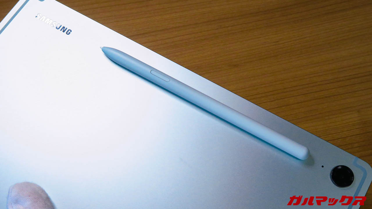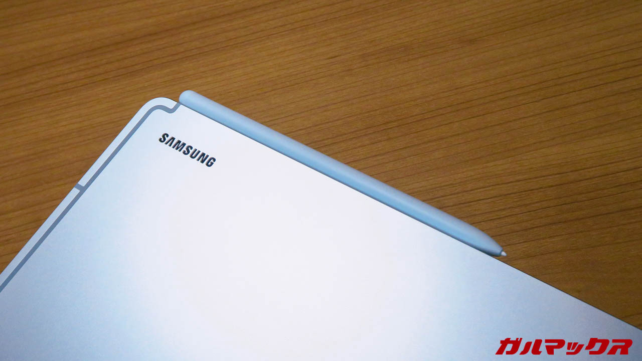 ▼なおGalaxy Tab S9 FE、上位版と同じく背面にSペンをくっつけることができます。ただあちらと違ってSペンをくっつける場所が区別されていない見た目なのでわかりにくいのは欠点ですが‥マグネットでくっつくので手探りでもいけるんで無問題。↓